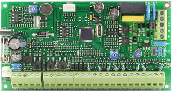8 zónás 4 partíciós riasztóközpont panel, 3 PGM (max. 8), 5+1 felhasználói kód, 20VAC. |